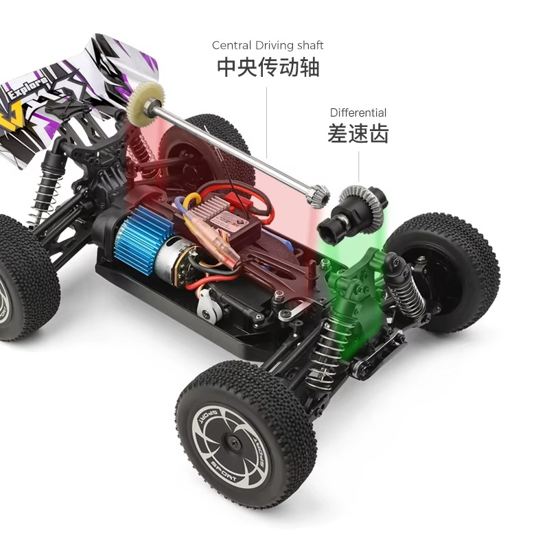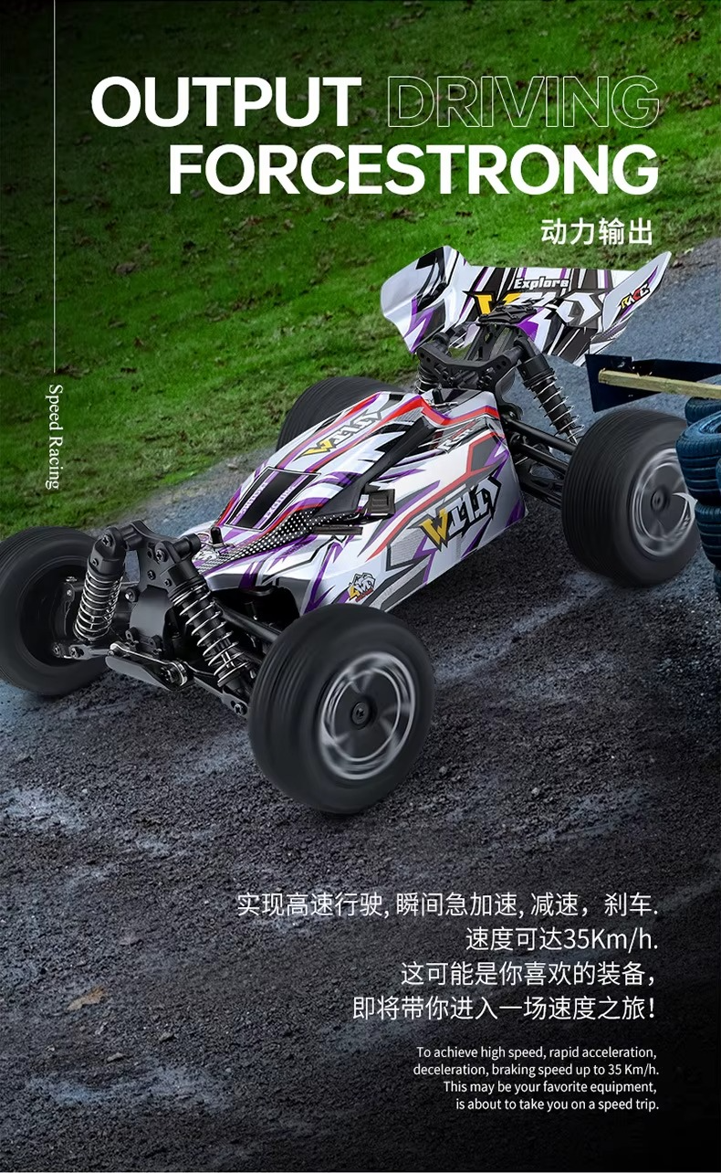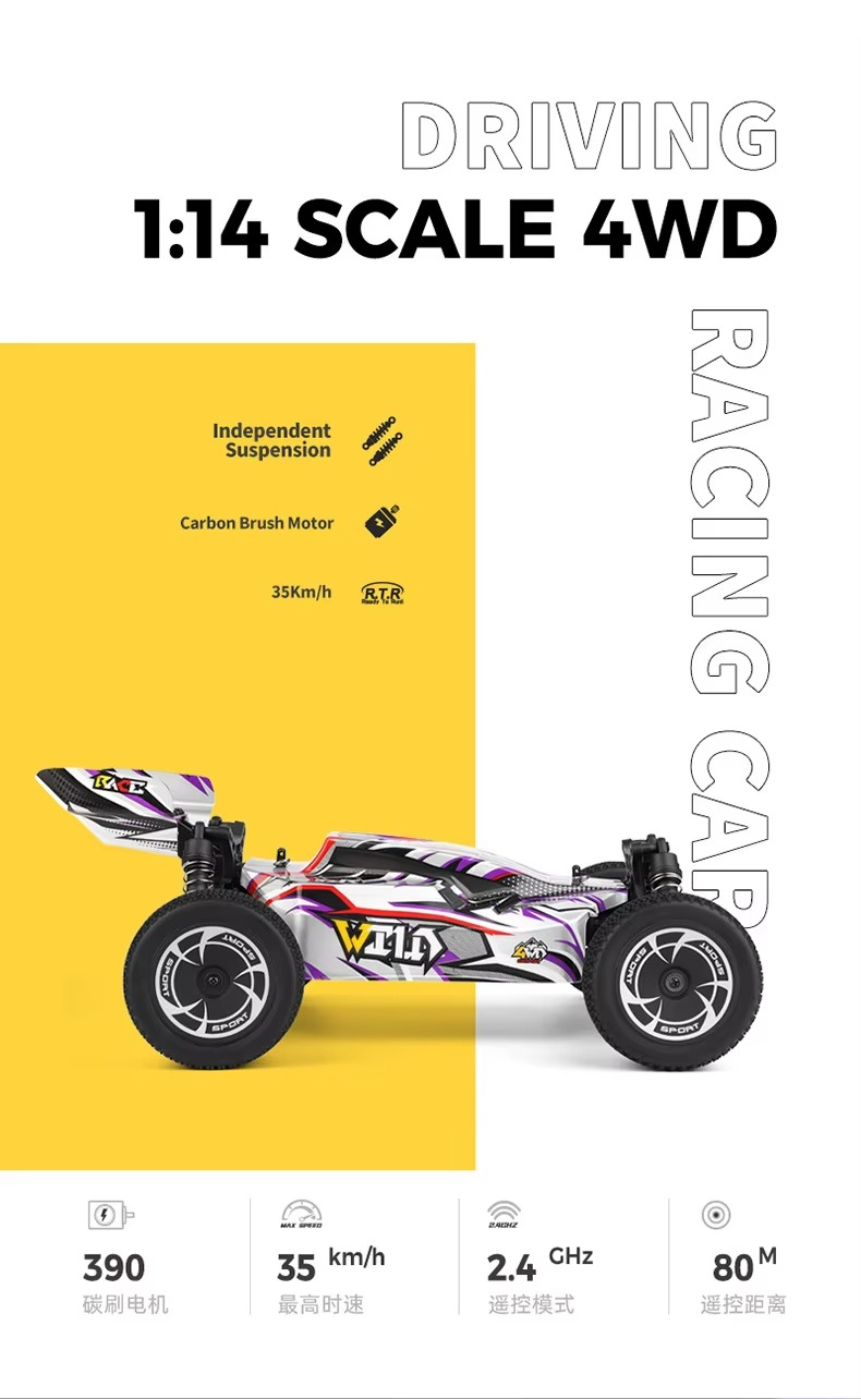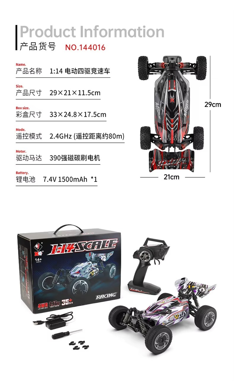 The WLtoys 144016 is a powerful and fun 1:14 scale 4WD remote control buggy engineered for high-speed off-road action.