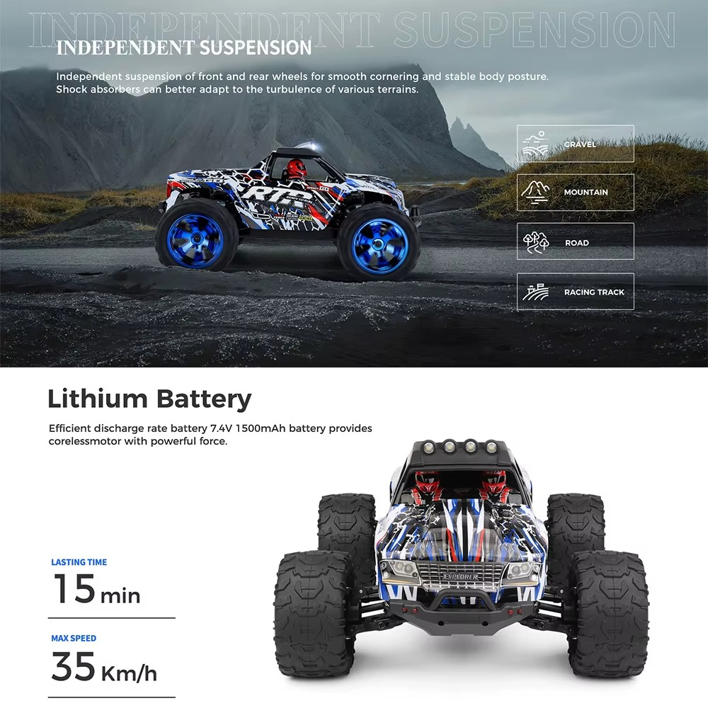 Its 4-wheel drive (4WD) system and independent suspension help maintain traction across varied surfaces, while the responsive 2.4 GHz radio delivers stable control with minimal interference. :contentReference[oaicite:1]{index=1}